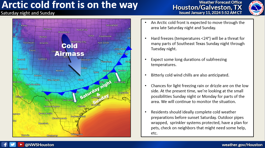 Freezing Temperatures Expected Starting SundayAccording to the National Weather Service, an Artic cold front is expected to move through our area on Sunday. Long durations of subfreezing temperatures (< 32°) and low wind chills are anticipated to last into mid next week. Residents should begin cold weather preparations now. Cold Weather PreparationResidents are advised to: - Monitor the latest forecasts, warnings, and updates for our area at weather.gov.